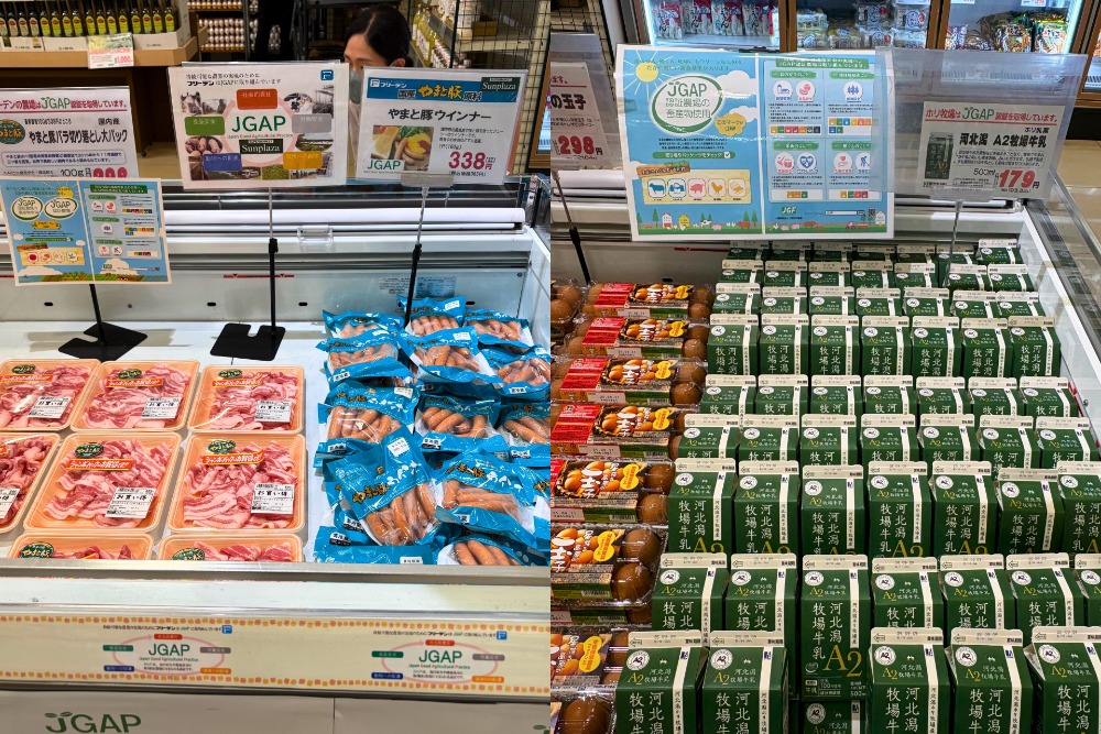 当日はイベントブースでJGAP認証商品の展示を行い、来店客にその取り組みを分かりやすく紹介しました。アンケートにご協力いただいた200組には、JGAP認証農場の生乳を使用したホリ乳業「河北潟A2牧場牛乳500ml」をプレゼント。さらに、JGAP認証農場で肥育されたフリーデン「やまと豚」の冷 しゃぶやウィンナーの試食を提供し、来店客にその味わいと安全性を実感いただきました。